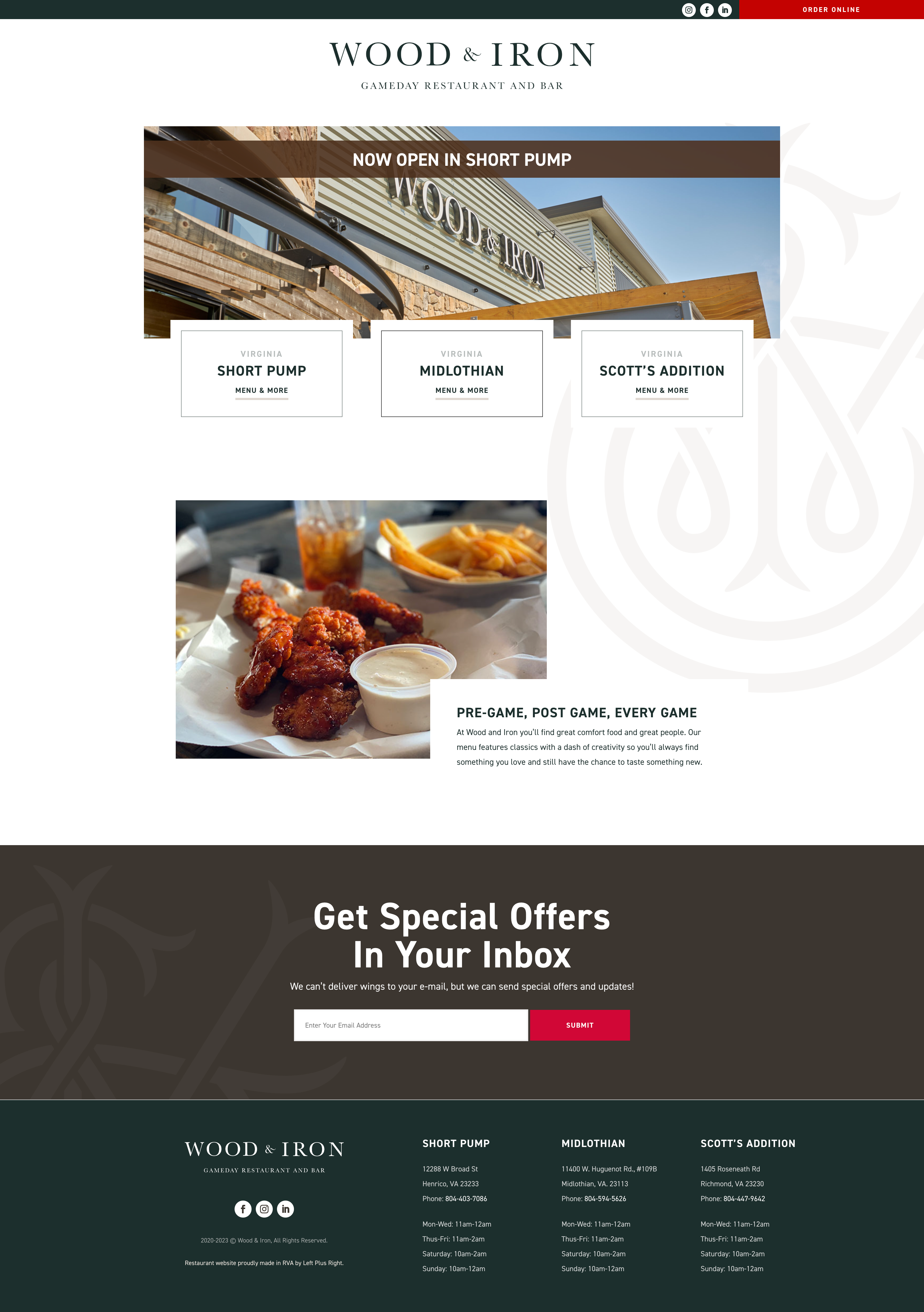 We started working with Wood & Iron when they had one location for their restaurant. When their business grew to two locations, and then three, they knew we could easily expand their web presence, because our restaurant websites are designed to grow as business does. Wood & Iron needed to highlight multiple locations and give customers an easy way to view their menus and order online.